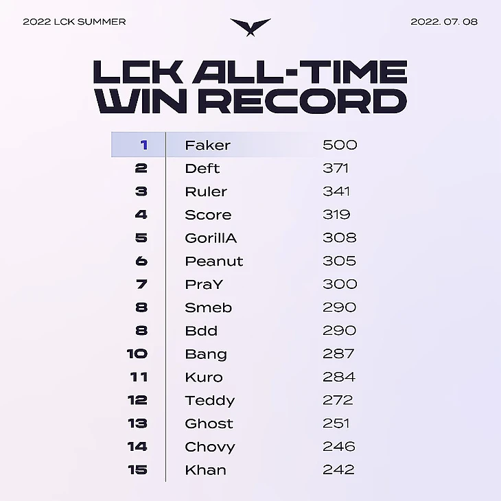 Faker стал первым игроком в истории LCK, одержавшим 500 побед