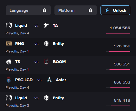 Для сравнения, лучший показатель по единовременному просмотру на The International 2022 находится на отметке в 1 054 586 зрителей. Он был зафиксирован в bo3 серии Liquid – Thunder Awaken.