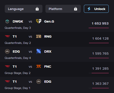 Наивысший пиковый онлайн ЧМ по LoL составляет 1 652 953 зрителей во время противостояния между DAMWON Gaming и Gen.G Esports.