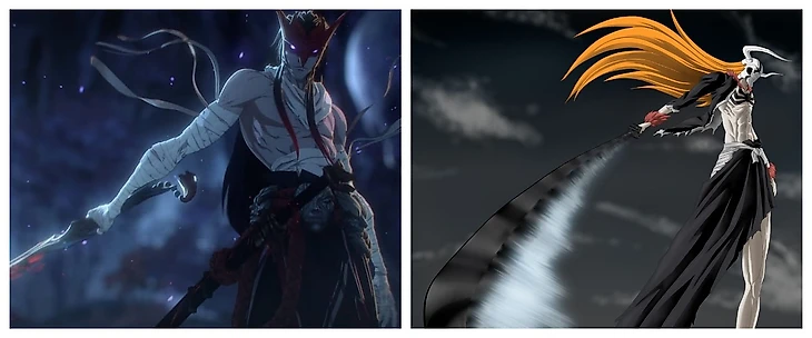 Подобную историю мы уже видели в аниме Блич. Центральный персонаж аниме – Ичиго Куросаки, наделенный способностями, вынужден сражаться со злыми духами, защищать людей и отправлять души умерших в загробный мир. Зангецу завладевает телом и разумом Ичиго, когда тот теряет сознание в бою. При этом белки глаз Ичиго темнеют, а зрачки начинают светиться золотистым цветом. На левой стороне лица начинает формироваться маска пустого. Если маску оторвать или разбить, Ичиго вернет себе контроль над телом.