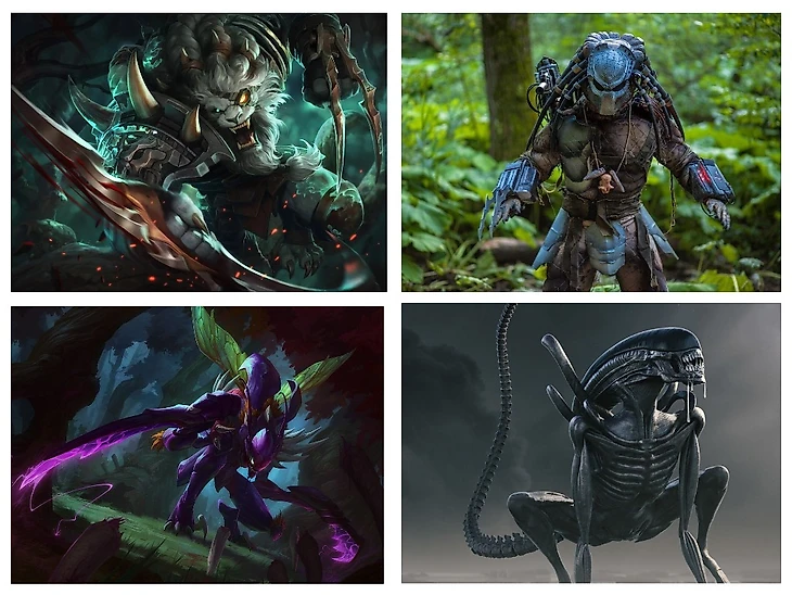 Уже с первого взгляда эти два лесника кого-то напоминают. Идеи для чемпионов взяты из фантастического экшн-хоррора «Чужой против Хищника». Вслед за Чаогатом ужасный хищник из Бездны Ка'Зикс проник в Валоран, чтобы пожрать сильнейших существ этого мира. С каждым убийством он становится мощнее, присваивая силу своей жертвы. Главная же цель Ка'Зикса Ренгар, единственный зверь, которого хищник считает себе ровней. Riot Games сумели отдать дань уважения этой классике, выпустив скин Ренгар – «Охотник за головами».