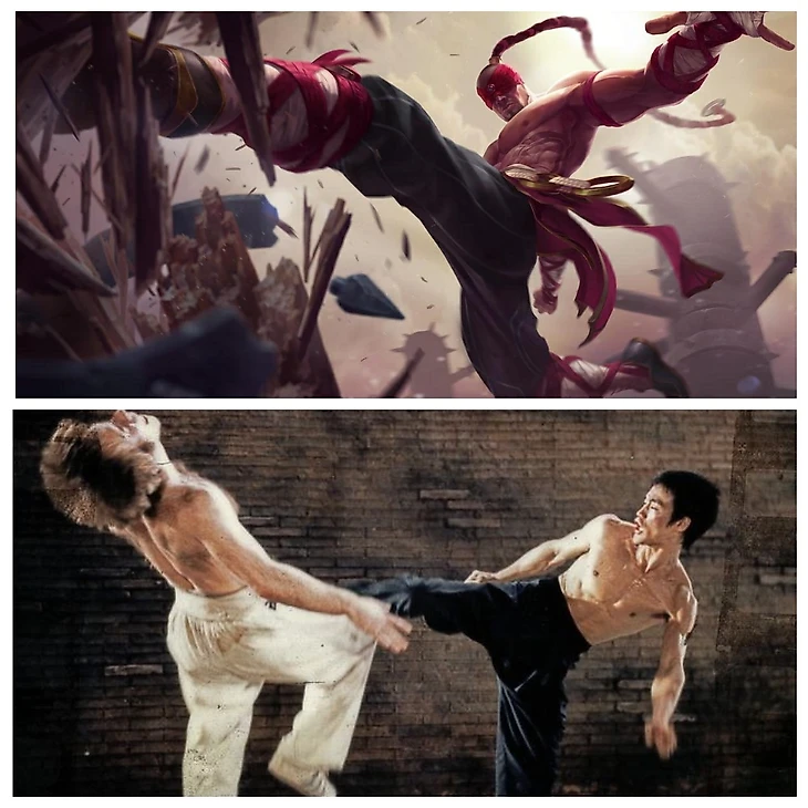 Увидев или пикнув Ли Сина в первый раз, совсем не трудно догадаться, какому культовому киноактеру Riot Games решили отдать дань уважения и создать персонажа по его подобию. Слепой монах, искусно владевший многими стилями боевых искусств, является репродукцией Брюса Ли.