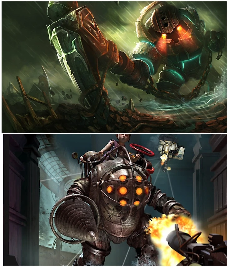 Наутилус – титан глубин. По Лору, у него нет ничего общего с Большими Папочками из Биошока. Зато визуально они очень похожи, за исключением орудия. Первый орудует большим якорем, второй – тяжелой дрелью.