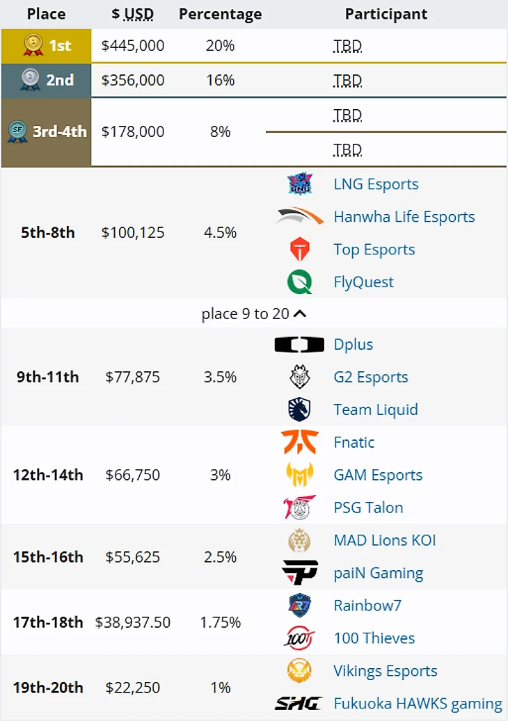 5-8 место. $100 125 – 4,5% призового фонда – LNG Esports, Hanwha Life Esports, Top Esports, FlyQuest;
