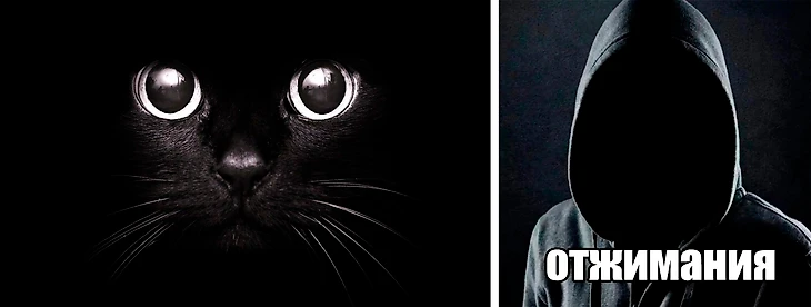 На самом деле эта картинка – гибрид стокового изображения черного кота и старого шаблона для мемов с темной фигурой в капюшоне. Фото специально вытянули и снизили качество, чтобы выглядело более абсурдно и нелепо.