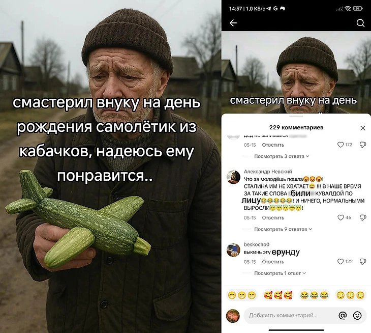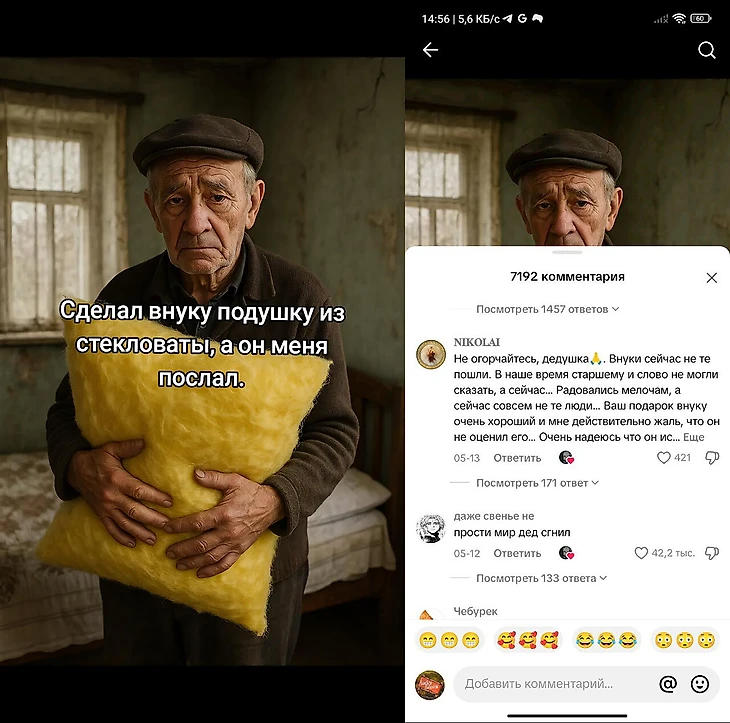Автор добавил типичные фразочки сммщиков для выпрашивания лайков, кучу бумерских смайлов, и готово – дед сделал для внука тренд из нейрослопа, а внук сказал, что он старый болван. У него на аккаунте полно подобных роликов. И все они под неизменную мелодию «Встреча двух сердец» Павла Ружицкого.