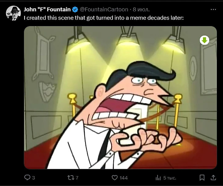 💬 «Я сделал эту сцену, которая годы спустя стала мемом», – режиссер и аниматор мультфильмов Джон Ф. Фонтейн, работавший над «Волшебными родителями», «Жизнь и приключения робота-подростка» и так далее.