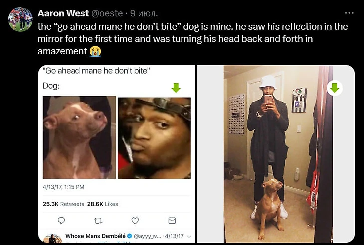 💬 «Собака из мема «Не бойся, он не кусается» моя. Он впервые увидел свое отражение в зеркале и крутил головой с восхищением», – oeste.