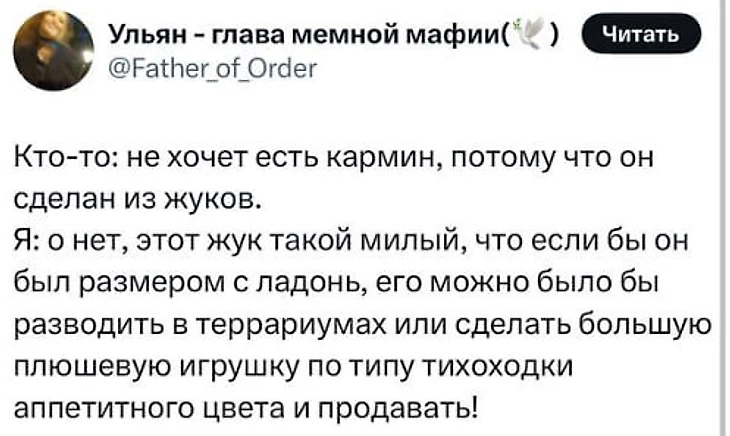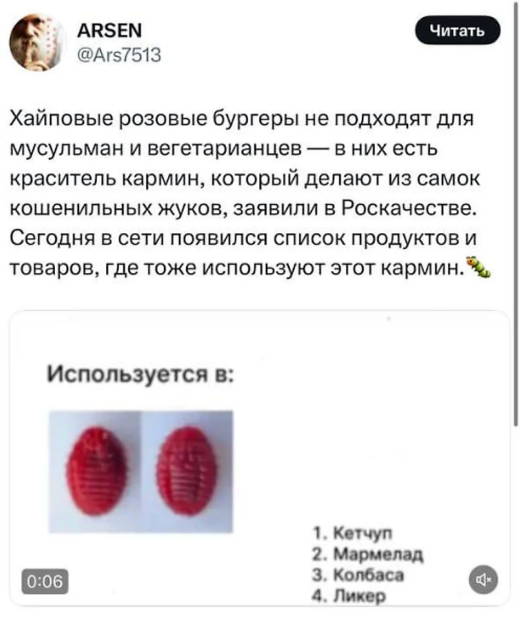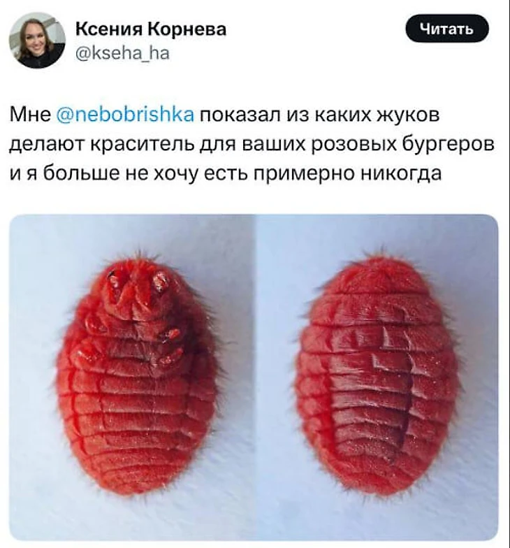 Нашумевший коллаб Hello Kitty с «Вкусно – и точка» породил новый мем. Люди в твиттере узнали, что розовая краска для бургеров делается из кошенильных жуков, и начали отказываться от бургеров.