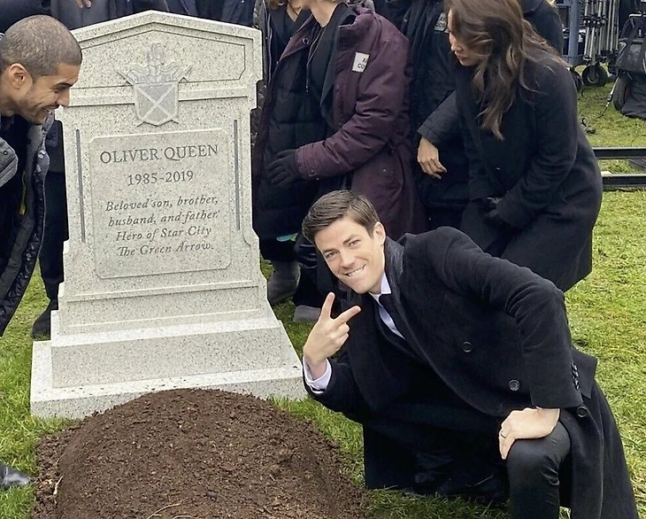 Звезда сериала «Флэш» Грант Гастин впервые обсудил великий мем со своим участием, когда актер на съемках «Стрелы» позировал рядом с надгробием Оливера Куина. Прошло 5 лет, но мем жив до сих пор!