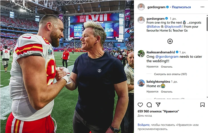 Популярный шеф-повар Гордон Рамзи опубликовал фото 2023 года, на котором поздравляет Келси с победой на чемпионате НФЛ: