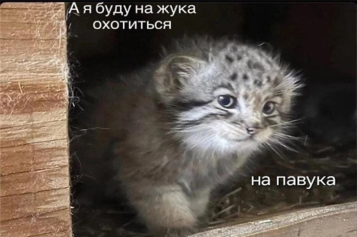 Милый и трогательный мем с детенышем манула. Фото с подписью «А я на жука буду охотиться, на паука» появилось в начале июня и стало вирусным в июле благодаря невероятно обаятельной мордочке. Шаблон легко адаптируется под любые жизненные ситуации.