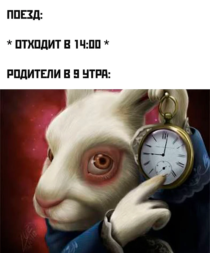 Белый Кролик – персонаж из книги Льюиса Кэрролла «Приключения Алисы в Стране чудес». Он вечно спешит и опаздывает, о чем напоминают его карманные часы. Именно он уводит Алису в нору и становится ее проводником в чудесный мир. Кролик символизирует суету и тревожность. Он появляется во всех экранизациях, включая фильм Тима Бертона 2010 года. В таком образе персонаж и стал основой для мема.