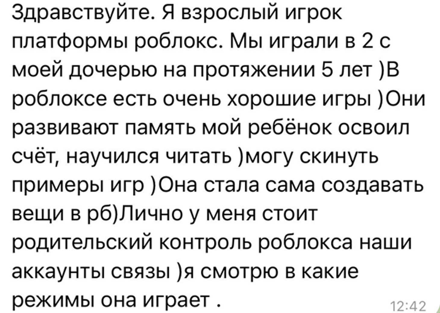 💬«Тут начали разгонять информацию о том, что про Roblox мне пишут только подростки. Это не так. Мамы и папы тоже очень активно шлют письма. Разные мнения есть у родителей школьников».