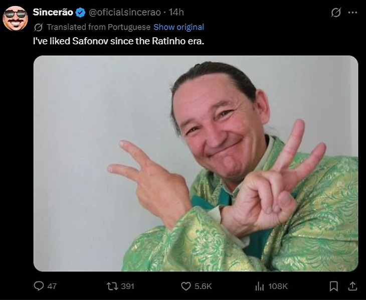 А в бразильской части интернета его сравнивают с комиком и рьяным болельщиком Палмейраса Марко Антониу Риччарделли (Marquito), который был ведущим популярной передачи «Ратинья»: