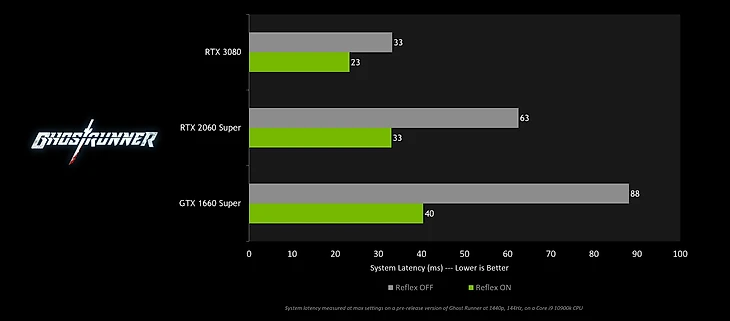 Nvidia продемонстрировала, как в киберпанк-экшене Ghostrunner удалось уменьшить задержку на разных видеокартах при помощи Reflex.