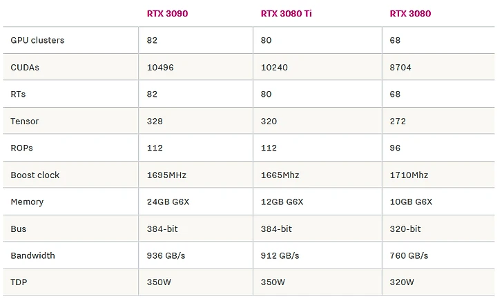 Компания пообещала, что 3080 Ti будет в 1,5 раз производительнее, чем 2080 Ti. А вот сравнение с ближайшими конкурентами из той же линейки.