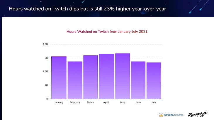 У Twitch в последние два месяца число просмотров держится на уровне 1,8 миллиардов часов. Однако, это стало худшим показателем с начала 2021 года. Причиной этому может быть послабление карантинных ограничений в США.