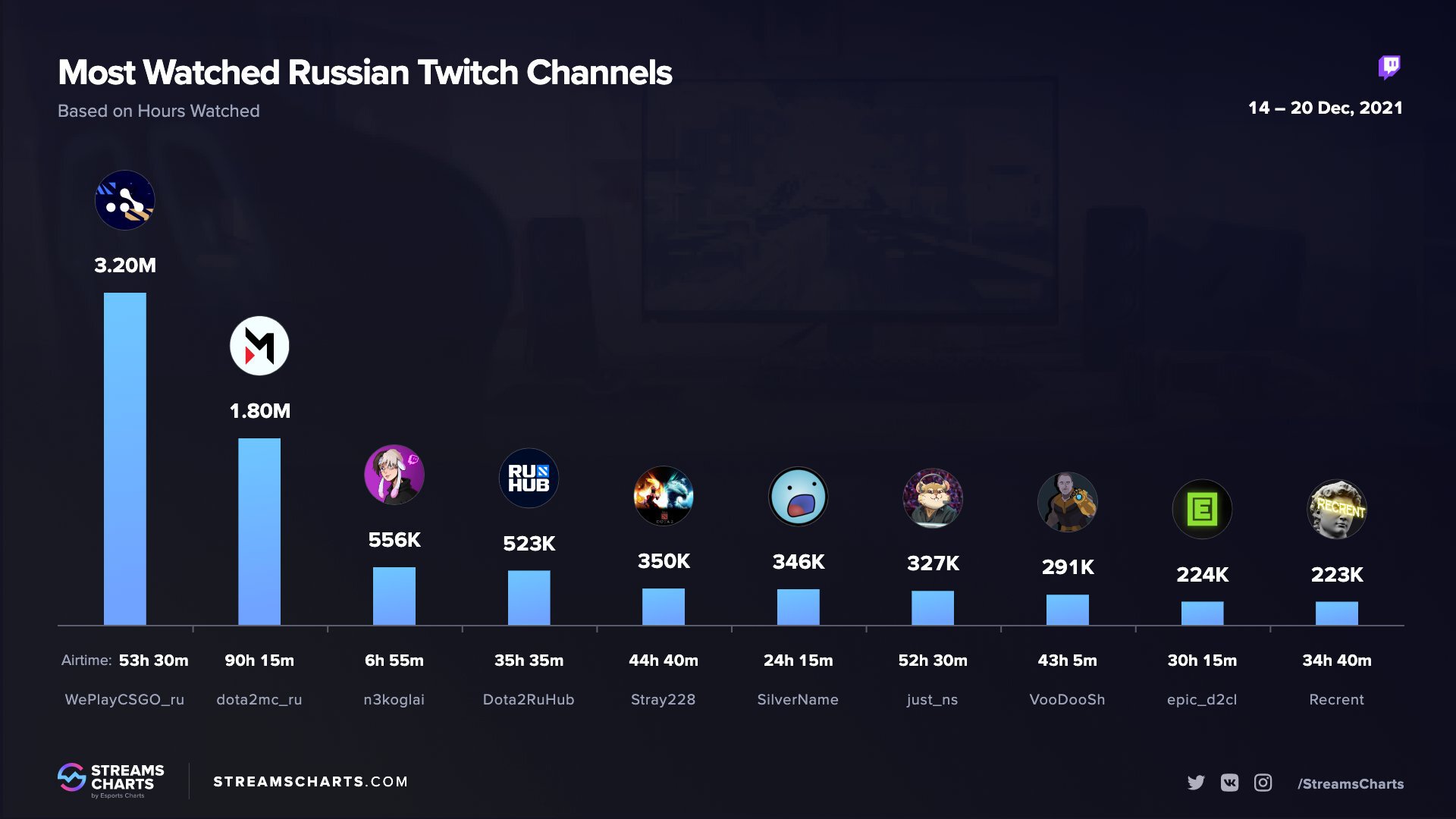 Сайт Esports Charts подвел итоги просмотров русскоязычного сегмента Твича за неделю с 14 по 20 декабря.