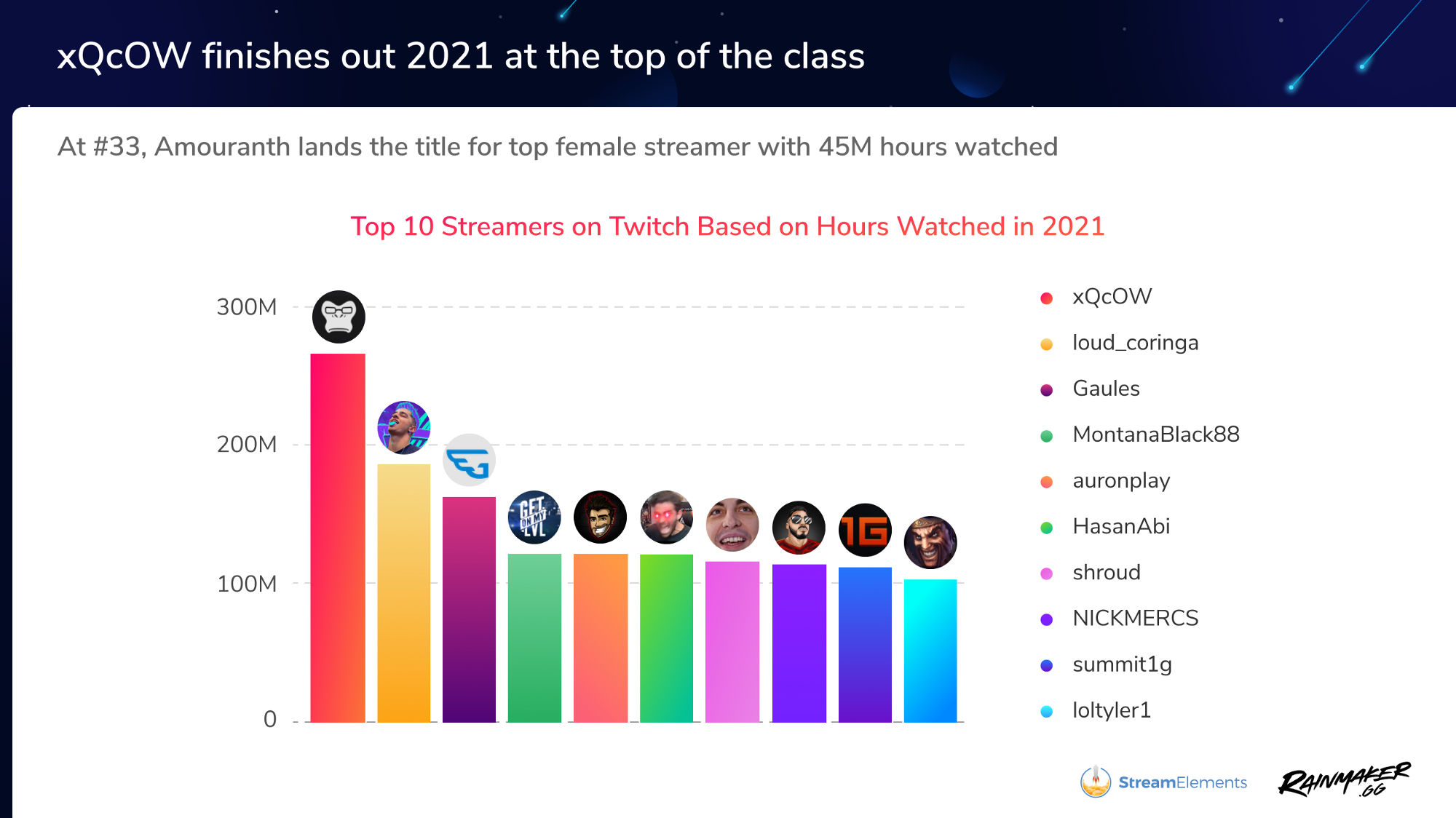 По совокупному количеству часов самым просматриваемым стримером стал xQxOW, Amouranth – 33-я с 45 млн часов, что стало лучшим результатом среди девушек стримеров.