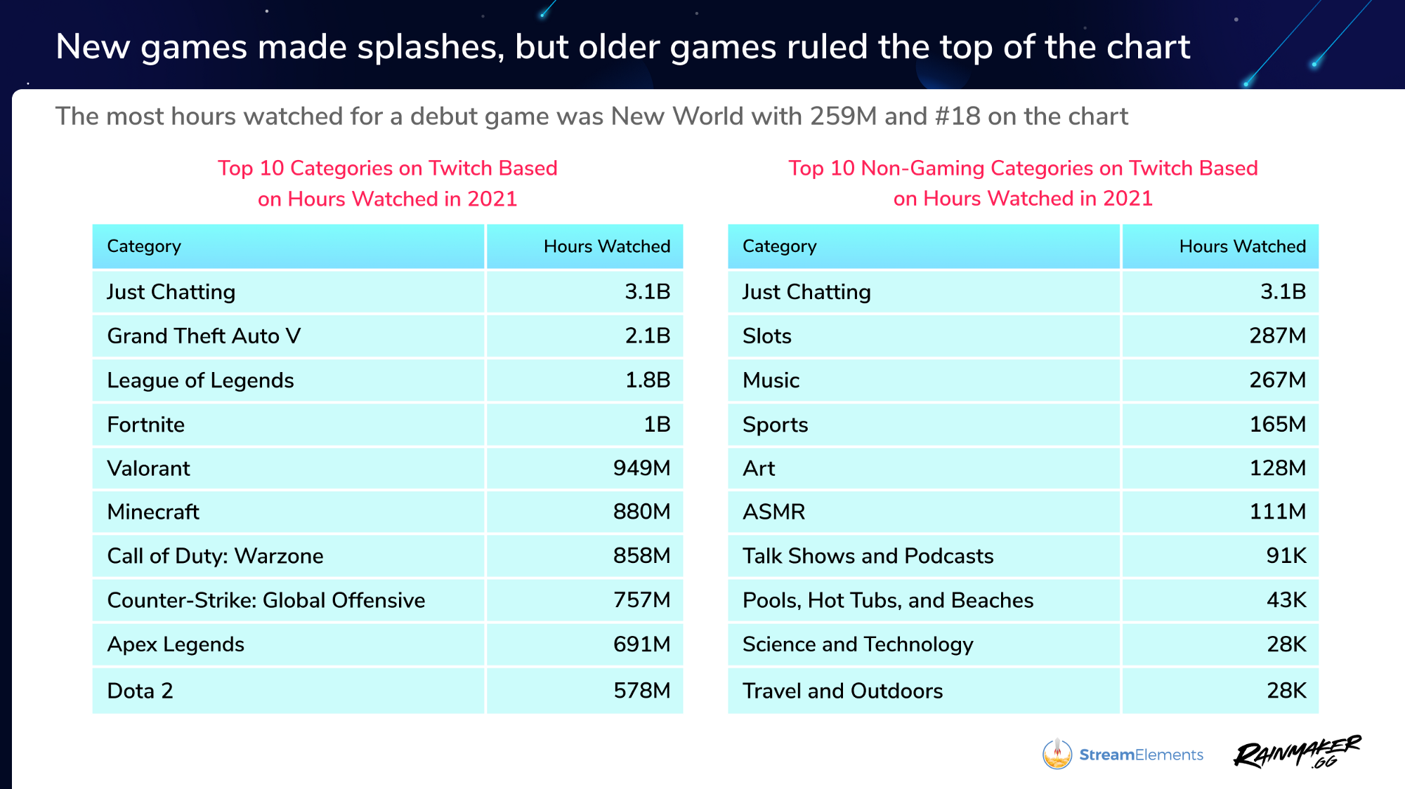 Самой просматриваемой игровой категорией стала GTA 5, набрав 2,1 мдрд часов просмотров, League of Legends на втором месте с 1,8 млрд часов.