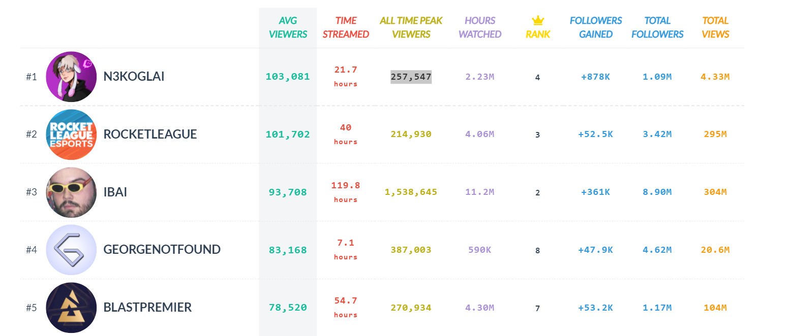 Nekoglai стал первым по среднему онлайну на Твиче. За последние 30 дней его смотрело 103 тысячи человек