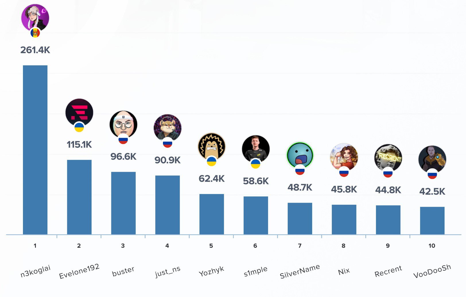 На первой строчке списка расположился Некоглай – 261 тысяча зрителей. Это на 146 тысяч больше, чем у Эвелона – 115 тысяч.