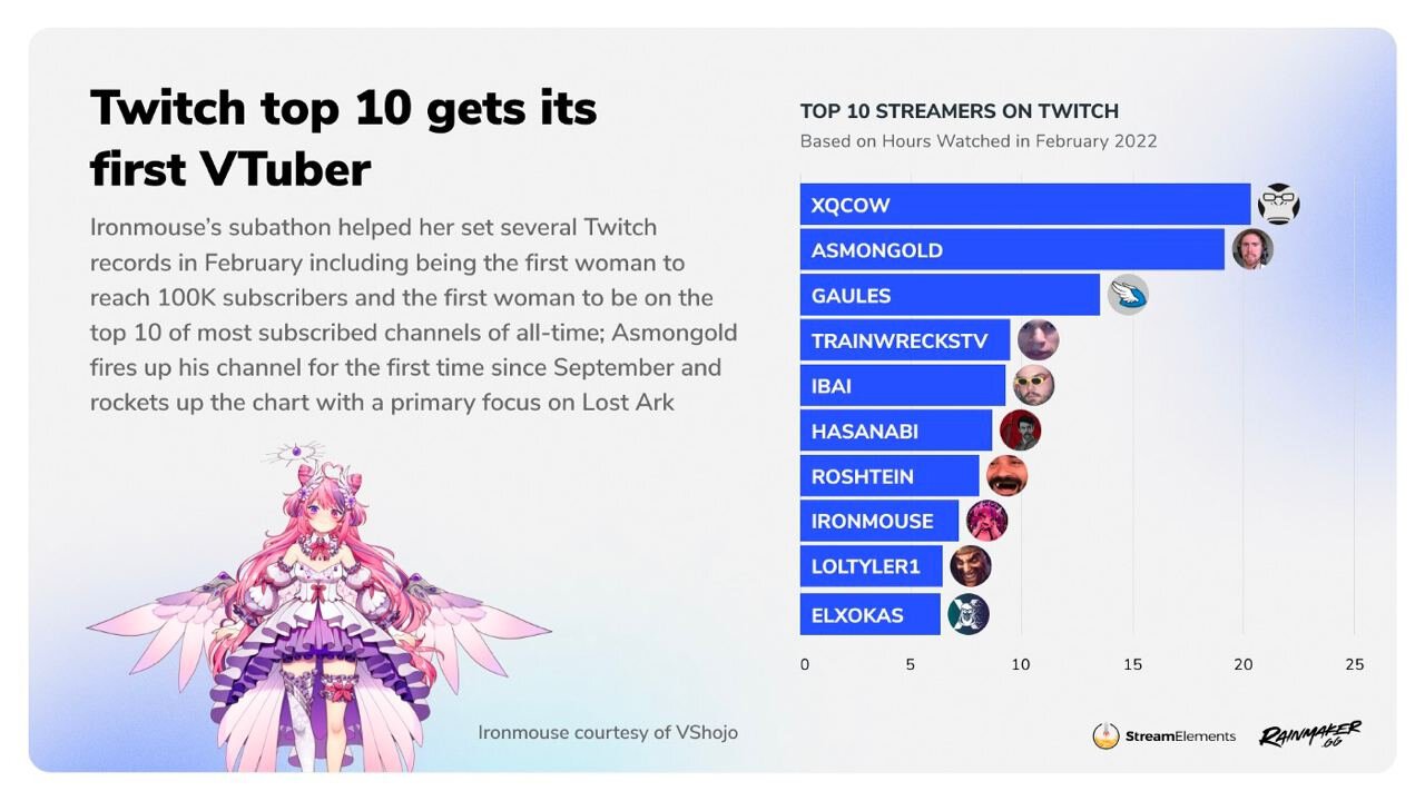 Витьюберша IronMouse заняла восьмое место в топ-10 стримеров на Твиче за февраль.