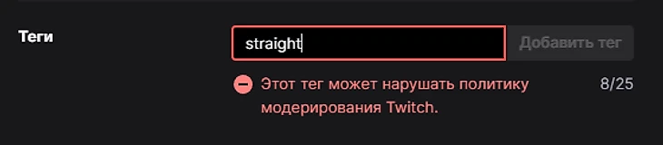 При этом, если поставить теги «белый» и «натурал» на русском языке, то Twitch позволяет их использовать для трансляции.