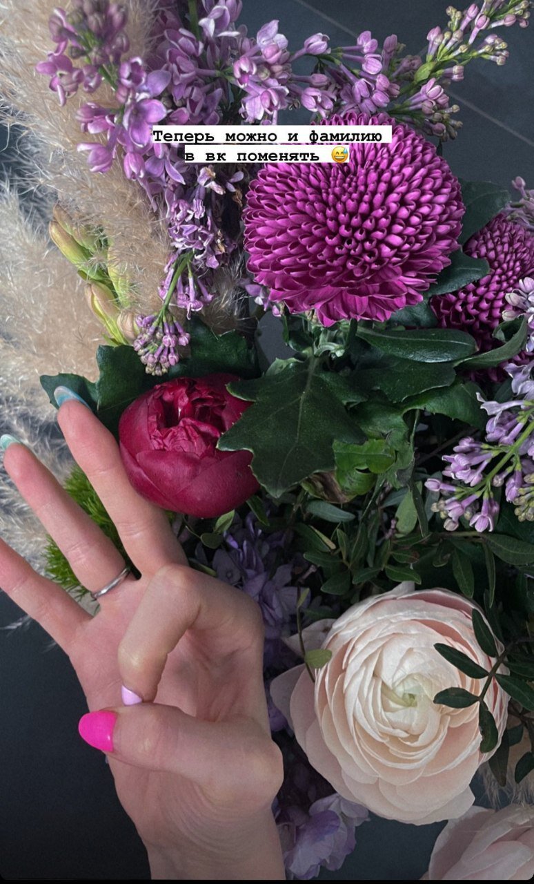 Екатерина выложила в инстаграме фото с обручальным кольцом и подписью «Теперь можно и фамилию в ВК поменять», после чего действительно поменяла фамилию в соцсети на «Давыдову».