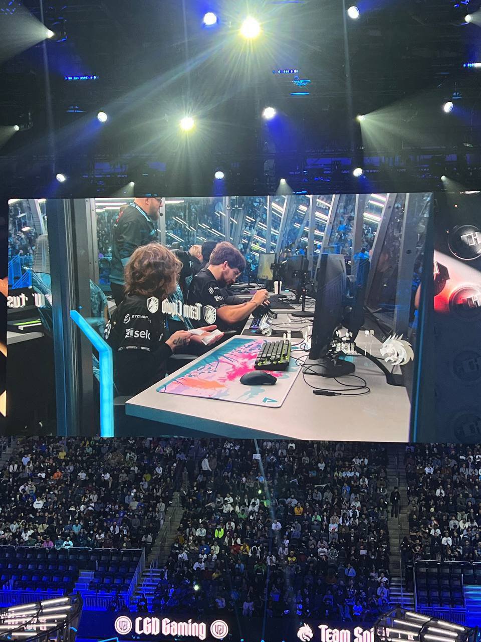 Евгений «Aunkere» Карьят поделился фотографией керри Gladiators Антона «Dyrachyo» Шкредова с арены The International 2023. Киберспортсмен играл матч с Nouns за проход в топ-6 турнира на коврике от Евгения.