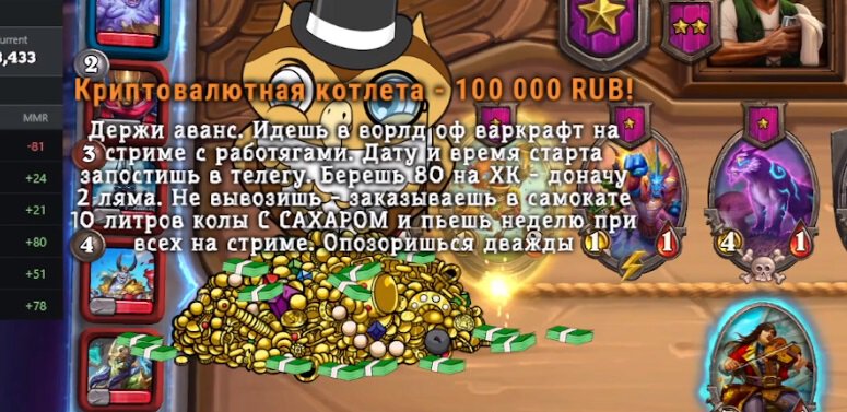 «Держи аванс. Идешь в WoW на стриме с работягами. Дату и время старта запостишь в телеграм. Берешь 80-й уровень на хардкоре – доначу 2 млн рублей. Не вывозишь – заказываешь в «Самокате» 10 литров «Колы» с сахаром и пьешь неделю при всех на стриме», – написал донатер Владислава «SilverName» Синотова.