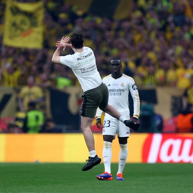3 болельщика в футболках с надписью «Mellstroy» выбежали на поле в финале Лиги чемпионов на 30-й секунде. Стример обещал за это 30 млн рублей
