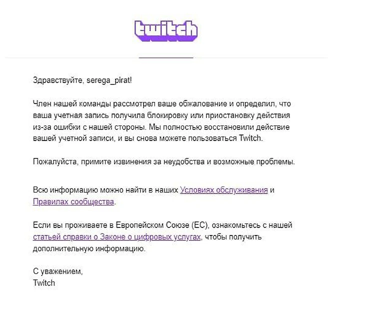 Серегу Пирата разбанили на Твиче после ошибочной блокировки.