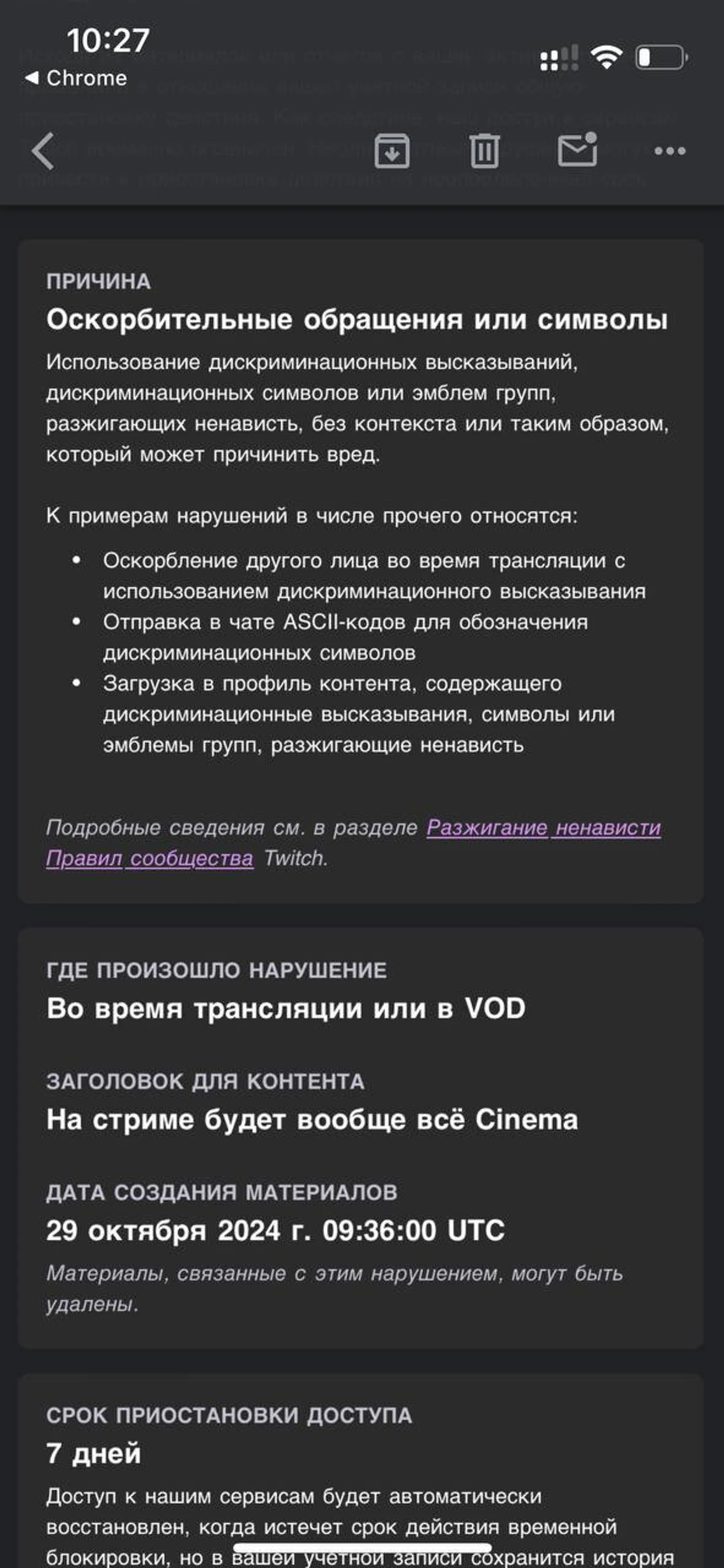 Причина блокировки – «оскорбительные обращения или символы», срок – 7 дней. Юзя не уточнил, за что именно он получил бан.