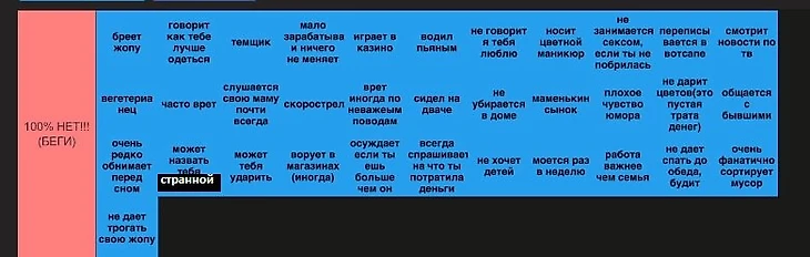 В список самых главных рэд флэгов в том числе вошли: «темщик», «мало зарабатывает и ничего не меняет», «носит цветной маникюр», «скорострел», «слушает свою маму почти всегда», «сидел на дваче», «моется раз в неделю», «не дает трогать свою жопу»