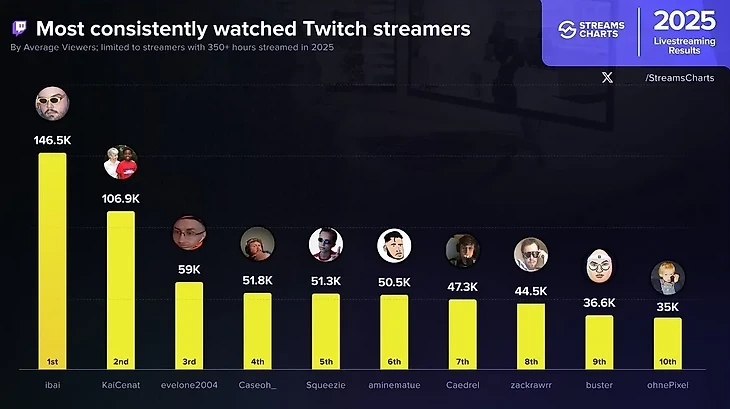 Топ-10 стримеров Твича 2025 года по среднему онлайну: