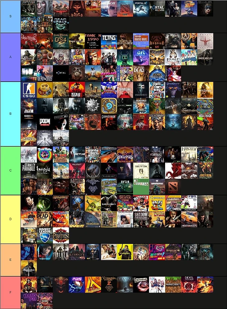 23. Составил объективно-субъективный тир-лист по всем играм, которые когда-либо стримил. В S-тир попали, помимо прочего, Warcraft 3, «Ведьмак 3», старая Dota 2, Detroit, Portal 2 и Dead Space 2. В A-тире Dark Souls 2 и 3, Ori и Dead Cells, в B-тире – CS:GO и Hearthstone. В F-тире, на самом дне рейтинга, Death Stranding, Red Alert 3 и Minecraft.