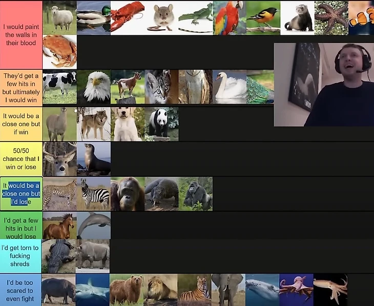 38. Пока спонсоры и Понасенков судились, Папич занимался по-настоящему серьезным делом: составил тир-лист животных, которых бы победил 1 на 1. В тире «Настолько бы испугался, что не стал бы драться» – бегемот, акула, медведь, лев, тигр, слон, кит, осьминог и кальмар. Зато овце, утке, крабу, мыши, различным птицам и хорьку он бы навалял.
