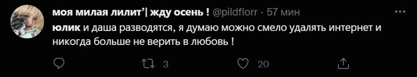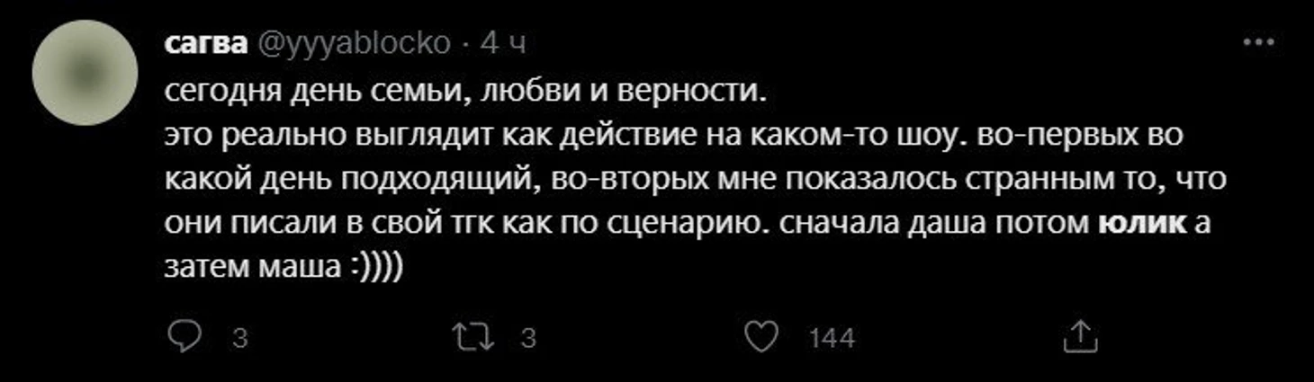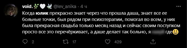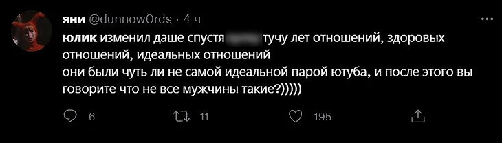 «Я сначала подумал, что это пиар-ход, потом залез в комменты у Юлика под последним роликом и понял, что вряд ли кому-то такой пиар-ход нужен. Я не хочу быть человеком, который говорит прописные истины, но <…> никто не должен оставаться в отношениях, если у человека нет чувств к своему партнеру, партнерше. Неважно, даже если есть дети, даже если есть штамп в паспорте. Поэтому я рискую заработать #### [блин] еще несколько тысяч отписок, но просто смиритесь с тем, что не вам решать #### [блин] с кем Юлик хочет встречаться, какие отношения должны жить, а какие умереть. Относительно того «как это некрасиво спустя месяц после свадьбы» − ну, знаете что, ребята, вы-то все, наверное, переженившиеся, верные и так далее. <…>