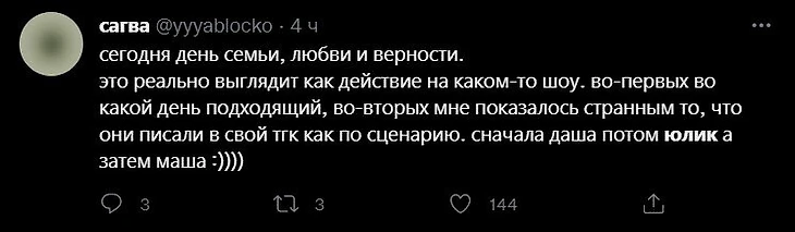 Комментаторы разделились на две группы: одни все еще не верят в развод и считают, что пара просто хайпит; другие публикуют «пророческий» ролик со свадьбы, где отец Юлика отталкивает его от Маши Мармарис. И припоминают фразу Онежко: