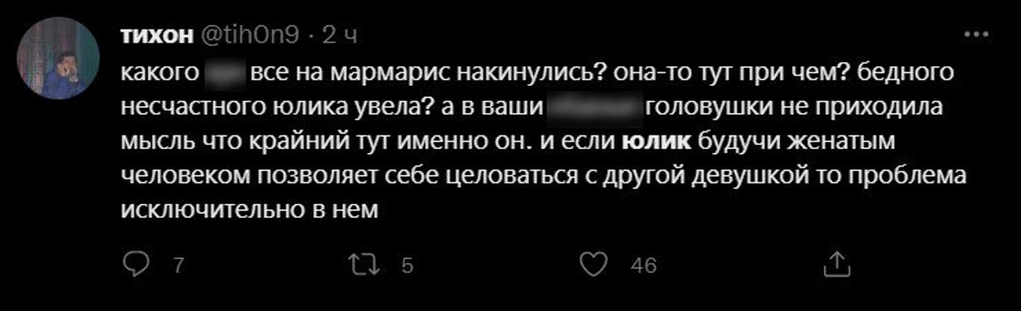 Блогерша Мария Мармарис тоже подключилась: «Лучше так, чем врать», − это слова о признании Юлика. Девушку моментально засыпали вопросами и оскорблениями в личке: «Как интернет любит копаться в чужом белье, мило. Постирайте лучше свое. Не знать ситуации и говорить эти вещи… Вы грязь, выдумщики», − написала Мармарис в телеграм-канале.