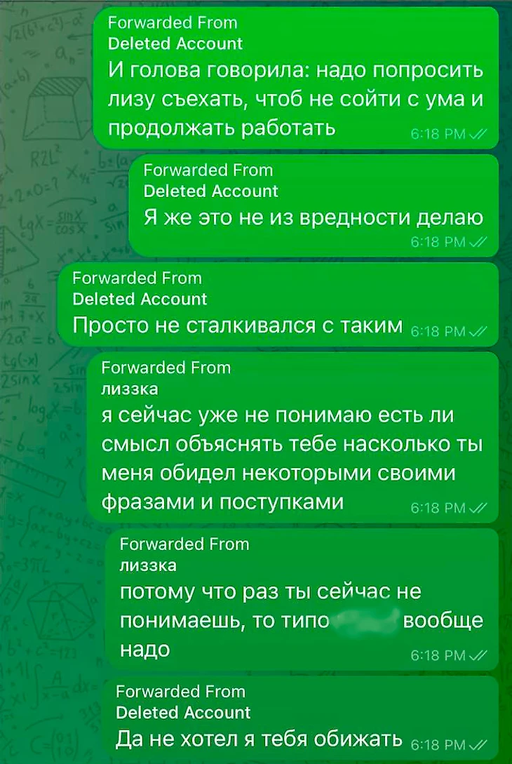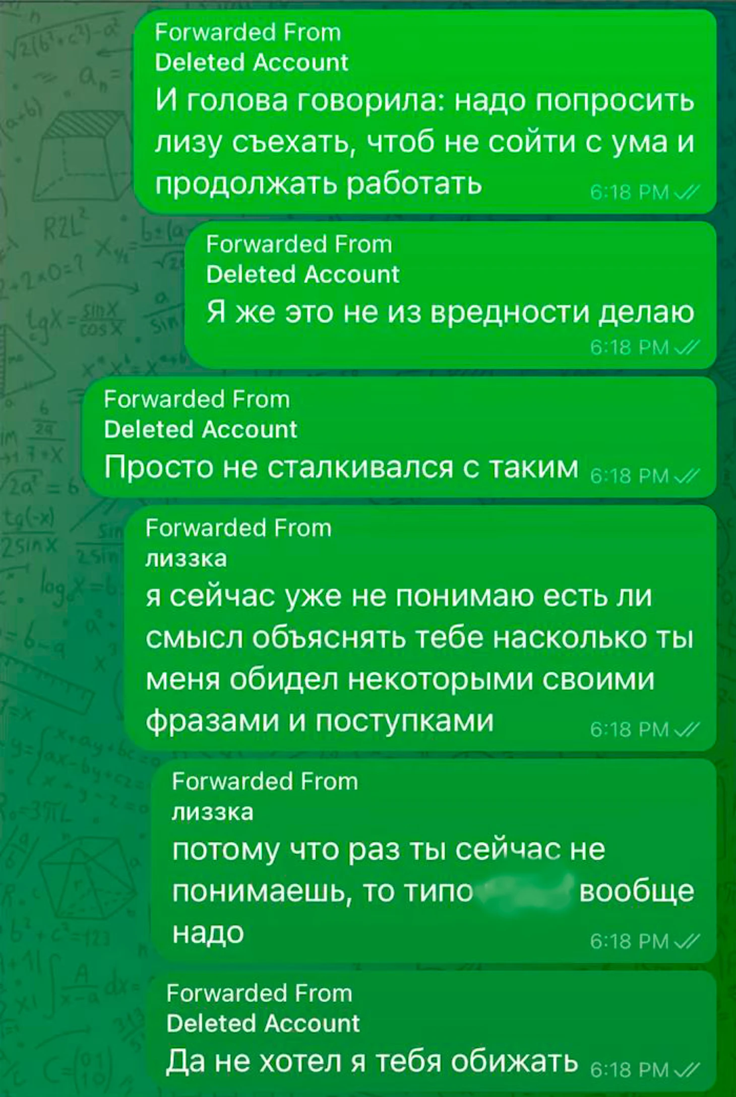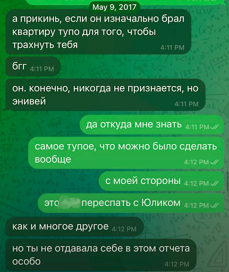 «Это он мне и сказал, что если я себе отчета не давала, то это нельзя называть сексом, нельзя говорить, что ты с Юликом переспала. С Юликом мы дальше общались и жили в одной квартире, но я точно уже сейчас не могу сказать, о чем и как происходило это общение. Я точно помню, что мне было неловко и некомфортно, но виду я не подавала, потому что как будто бы для меня было важно, чтобы об этом тогда никто не узнал. Мне было некомфортно от того, что кто-то может узнать, кроме моего близкого друга. Я точно помню фразу от Юлика: «Я всегда добиваюсь того, чего я хочу», после которой мне стало максимально ##### [плохо]. Я тебе че, ##### [черт возьми], ачивмент? Ну, и поскольку внезапной эскалации наших взаимоотношений так и не произошло, думаю, понятно, по каким причинам он попросил меня съехать. <...>
