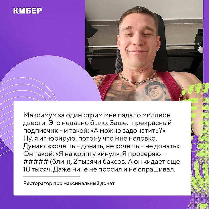 Максимум за один стрим мне падало миллион двести. Это недавно было. Зашел прекрасный подписчик – и такой: «А можно задонатить?» Ну, я игнорирую, потому что мне неловко. Думаю: хочешь – донать, не хочешь – не донать. Я тут не сижу, не выпрашиваю. Мне вообще ###### (все равно). Он такой: «Я на крипту кинул». Я проверяю – ##### (блин), две тысячи баксов. А он кидает еще 10 тысяч. Даже ничего не просил и не спрашивал.