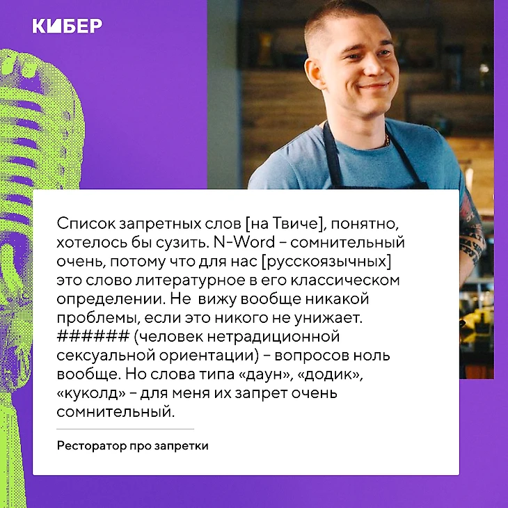 «Список запретных слов, понятно, хотелось бы сузить, – перечисляет он. – N-Word – сомнительный очень, потому что для нас [русскоязычных] это слово литературное в его классическом определении. Не вижу вообще никакой проблемы, если это никого не унижает. ###### (человек нетрадиционной сексуальной ориентации) – вопросов ноль вообще. Но слова типа «даун», «додик», «куколд» – для меня их запрет очень сомнительный».