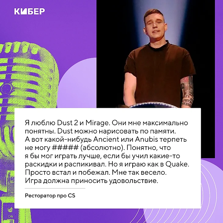 Любимые карты Ресторатора – Dust 2 и Mirage: «Они мне максимально понятны. Dust можно нарисовать по памяти». А нелюбимые? «Какой-нибудь Ancient или Anubis терпеть не могу ##### (абсолютно). Понятно, что я бы мог играть лучше, если бы учил раскидки и распикивал. Но я играю как в Quake. Просто встал и побежал. Мне так весело. Игра должна приносить удовольствие. Мне не важно, выиграли мы или проиграли. Если там пацаны с читами, то никакого удовольствия нет. Я думаю: блин, ну я нубас, куда вы еще говно подрубаете? Играйте честно. У меня еще поджигает жопу, когда заходят школьники и такие: дед, ну куда ты в CS? Я говорю: «Вы ####### (малолетки), вас не было еще, когда я в нее уже играл».