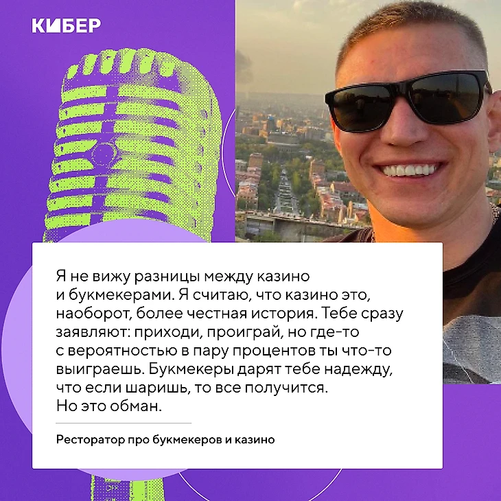 Я не вижу разницы между казино и букмекерами. Я считаю, что казино, наоборот, более честная история. Тебе сразу заявляют: приходи, проиграй, но где-то с вероятностью в пару процентов ты что-то выиграешь. Букмекеры дарят тебе надежду, что если шаришь, то все получится. Но это обман».
