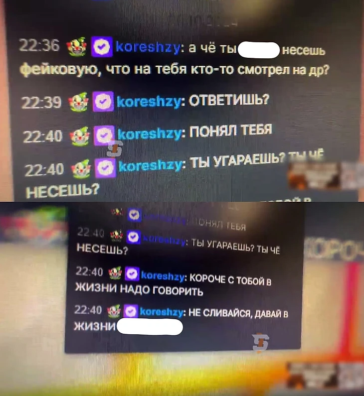 «Я в первый и в последний раз объясняю, в чем у меня конфликт с Корешем. Просто не люблю, когда мне люди в #### ####### [в лицо врут], а мне не то, чтобы наврали в лицо, а прямо срыгнули в #####. И чел еще обижается на меня. Мне ##### [плевать] на них».