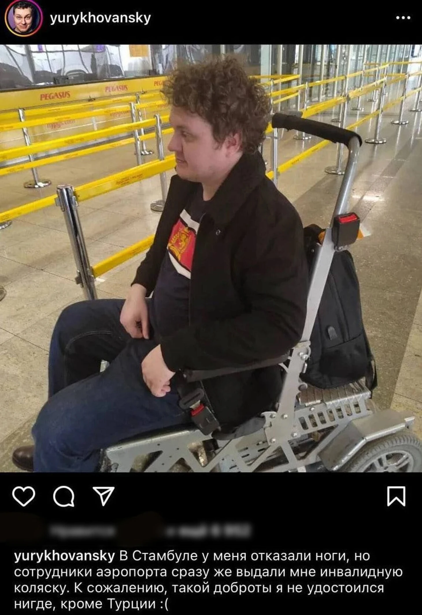 2 года назад у Хованского уже была похожая проблема с ногами – в аэропорте Стамбула ему выдавали инвалидную коляску для передвижения. Видимо, он так и не долечился с тех пор.
