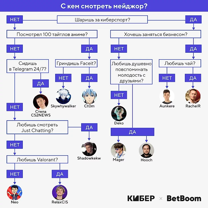 Пять лет назад перед любым турниром мы первым делом шли узнавать ведущих и комментаторов. Теперь главный вопрос – кто из стримеров будет транслировать матчи? На BLAST Austin Major множество совершенно разных комьюнити-кастов. От ламповых посиделок Хуча и Магера до лидера жанра Шадоукека, который вместе с Эвелоном и Базом показывает мейджор прямо из Америки – благодаря поддержке BetBoom.
